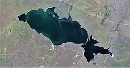 Saumalkol is an endorheic lake in the Shiderti basin, Kazakh Uplands. The lake is elongated and stretches in a roughly WNW/ESE direction for over 5 kilometers (3.1 mi). There is a 10 centimeters (3.9 in) to 15 centimeters (5.9 in) thick layer of silt at the bottom of the lake. Large swathes of the shoreline are covered with reeds. The western and southern sections of the lakeshore are rocky, while to the east and northeast there are swampy areas. The lake surface usually freezes in the first half of November and thaws by mid April.[4][3]
