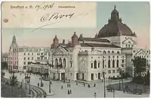 Opened in 1782, the Comoedienhaus (comedy house) was the first permanent venue of the Frankfurt theatre, both plays and opera (drama and opera).[3][4] Its traditional house, the Schauspielhaus, built in 1902 by architect Heinrich Seeling at the Theaterplatz (now Willy-Brandt-Platz) was destroyed in World War II during an air raid in 1944. In 1926, Brecht's A Respectable Wedding premiered.[5]
