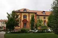In 2003, the old U-shape of the castle was rebuilt as Schloss Kirchheimbolanden Old People's Home (Seniorenresidenz Schloss Kirchheimbolanden), only the east wing being structurally reminiscent of its former form and splendour. But in this way the general shape of the old castle has been recreated as a three-winged complex.
