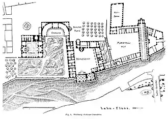 ![]() Aerial view of the palace and its church and gardens above the Lahn river (from the southeast) | |