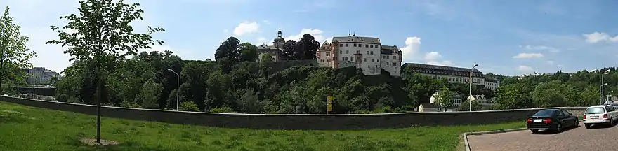 Schloss Weilburg (Weilburg Palace) is a Baroque schloss in Weilburg, Hesse, Germany. It is located on a spur above the river Lahn and occupies about half of the area of the Old Town of Weilburg. It contains the Hochschloss ("High Palace"), built between 1530 and 1572, which is one of the best-preserved Renaissance palaces in Hesse. In the 1700s, the palace was expanded by John Ernst, Count of Nassau-Weilburg, and his builder, Julius Ludwig Rothweil. The buildings and gardens now belong to the Verwaltung der Staatlichen Schlösser und Gärten Hessen, and they can be visited as a museum on guided tours. Parts of the palace are venues for the music festival Weilburger Schlosskonzerte, which is named after the palace.