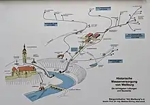 The waterpipes were originally carried over the Lahn by the Rothe Brücke. In 1784, high water and ice jamming destroyed this bridge, and in 1785-1786 it was replaced by the Kettenbrucke ("Chain Bridge"), which remained in service until 1934.[8]