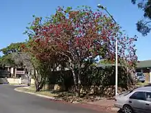Inland it is usually deciduous, especially where the winter season is very dry or there is risk of frost. The tree gets its new leaves in spring, usually early to mid-September. The new leaves are a very showy bright red as with many savanna trees. The red foliage colour fades through bronze to dark green over a period of 7 to 10 days. The red flowers are produced straight after the new leaves during September and October and are very attractive to bees. They sometimes produce so much nectar that it drips from the flowers. The "weeping" label in some of its common names refers to the copious quantities of nectar that may rain from the flowers when shaken rather than a tendency of the foliage to "weep" or "droop".