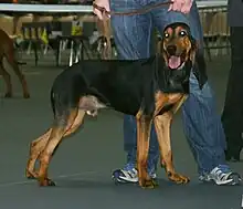 Schweizer Laufhunds stands between 49–59 centimetres (19–23 in) in males, and 47–57 centimetres (19–22 in) in females.[7] The general appearance is of a hound similar to the Schweizer Niederlaufhund, who the Schweizer Laufhund is generally considered the progenitor of. The head is noble with a friendly and soft expression and a deep chest. The legs are strong with a robust structure. At a calm pace they carry the tail low; when they run it is a bit lifted. The breed has long, drop ears and a long tail.[8]