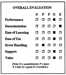 Reviewers would write a section on each category above within the review. A checkbox graphic for each review article allowed readers to see at a glance the reviewer's marks for each of the four categories, giving ratings of Unsatisfactory, Poor, Fair, Good, or Excellent.