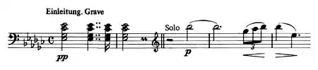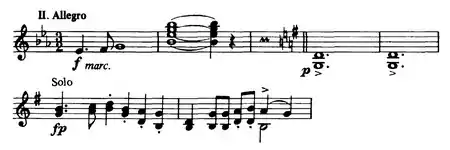 It is a four-movement fantasy on Scottish folk melodies. The first movement is built on "Through the Wood Laddie".[3] This tune also appears at the end of the second and fourth movements. The second movement is built around "The Dusty Miller", the third on "I'm A' Doun for Lack O' Johnnie", and the fourth movement includes a sprightly arrangement of "Hey Tuttie Tatie", the tune in the patriotic anthem "Scots Wha Hae" (with lyrics by Robert Burns).