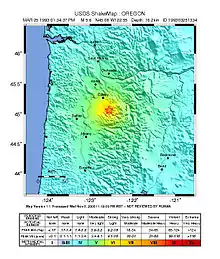 - ↑ Dewey, James W.; Reagor, B. Glen; Johnson, Dennis A.; Choy, George L.; Baldwin, Frank W. (1994). "The Scotts Mills, Oregon, earthquake of March 25, 1993; intensities, strong-motion data, and teleseismic data" (PDF). Open-File Report 94-163. United States Geological Survey.