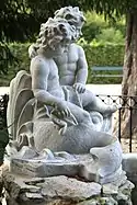 Appearing at the base of the grotto are four tritons—creatures who are half-man and half-fish—who are part of the sea-god's entourage. Each holds a conch shell trumpet with which they can inspire fear. They are restraining the sea-horses who draw Neptune's chariot across the seas.[40] This image of Neptune commanding the watery dominion was a common symbol in sixteenth, seventeenth, and eighteenth-century art, to represent monarchs controlling the fate of their people.[40] In the nineteenth century, a bank of evergreen trees was planted behind the white figural group to provide a dark contrast.[40]