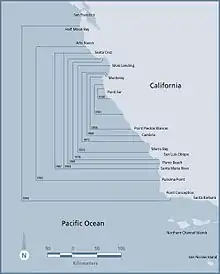 California is the only location where the southern sea otter (Enhydra lutris nereis) subspecies is found in significant numbers. In 1938, a couple testing a telescope discovered a group of about 50 of these animals in a remote part of the coast near Big Sur, California.[37] With conservation efforts, including the crucial pioneering of Monterey marine protected area by Julia Platt and Margaret Wentworth Owings and the Friends of the Sea Otter organization, this group has since grown and expanded its range.[27] However, recovery has been slow in comparison to sea otter populations elsewhere, and also in comparison to sympatric marine mammal species such as California sea lions and harbor seals.[38] Its average growth rate between 1914 and 1984 was only 5%, and it fluctuated or declined in the late 1990s.[39] The southern sea otter was listed under the Endangered Species Act as a threatened subspecies in 1977. A survey taken in the spring of 2007 counted a little over 3,000 sea otters in California, up slightly from previous years but down from an estimated pre-fur trade population of 16,000.[40] For the subspecies to be delisted from the list of threatened species, the count must average 3,090 or more over three years.[40] To aid in the efforts of sea otter preservation, the Monterey Bay Aquarium's Sea Otter Program has been observing southern sea otters from as far back as 1984.[5]