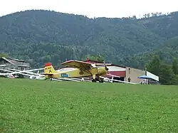Tug plane and gliders in front of the hangar of the Mountain Gliding School "Żar"