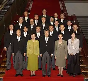 ![]() Prime Minister Junichiro Koizumi (front row, centre) with the re-elected cabinet inside the Kantei, November 19, 2003 | |