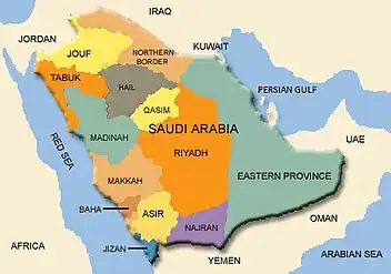 Sectarianism in Saudi Arabia refers to the Saudi government's "top-down push towards sectarian polarization" between the Sunni majority, and Shi'ite minority.[1] This encompasses anti-Shi'ite policies by the Saudi regime, as well as tensions between the Sunni majority and the Shi'ite minority. The Saudi government is often viewed to be oppressing the Shi'ite community, who constitute up to 15% of the Saudi population.[2] This occurs against the backdrop of the broader Iran-Saudi Arabia proxy conflict, since Iran is a Shi'ite republic.[3]