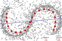 One-dimensional SOM versus principal component analysis (PCA) for data approximation. SOM is a red broken line with squares, 20 nodes. The first principal component is presented by a blue line. Data points are the small grey circles. For PCA, the fraction of variance unexplained in this example is 23.23%, for SOM it is 6.86%.[14]