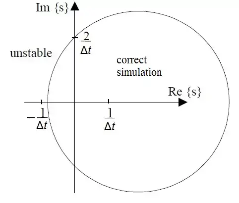 The stability region of the semi-implicit method was presented by Niiranen[2] although the semi-implicit Euler was misleadingly called symmetric Euler in his paper. The semi-implicit method models the simulated system correctly if the complex roots of the characteristic equation are within the circle shown below. For real roots the stability region extends outside the circle for which the criterion is