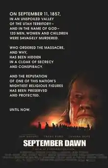 September Dawn is a 2007 Canadian-American Western film directed by Christopher Cain, telling a fictional love story against a controversial[2] historical interpretation of the 1857 Mountain Meadows massacre. Written by Cain and Carole Whang Schutter, the film was a critical failure and box office disappointment.