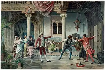 Encouraged by regional showings in Valladolid, which were well-received, in 1862 he participated in the National Exhibition of Fine Arts with a painting depicting "The Cid's oath in Santa Gadea". Two years later, he presented a Biblical scene showing the "Raising of Jairus' daughter", in hopes of winning a scholarship to Rome, but he was not successful. He had no more significant showings until 1878, when he received a third-class medal for his painting "An Excorcism", which was then sent to the Exposition Universelle in Paris. In 1881, the city of Málaga acquired his painting of the two lovers whose suicide inspired the name of a local landmark; the "Peña de los Enamorados" (Lovers' Rock).[1]
