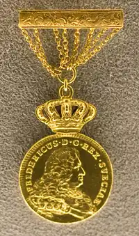 The Seraphim Medal is a gold medal of the 8th size. The obverse of the medal bears the effigy of King Frederick I with the inscription above FREDERICUS D.G. REX SUECIAE. The reverse of the medal bears these words in the centre: ORDO EQ SERAPHIN · RESTAURATUS NATALI REGIS LXXIII · (Order of the Seraphim restored on the seventy-third birthday of the King). Surrounding all of this is the collar of the Order of the Seraphim. Circumscribing the collar is the inscription PROCERES CUM REGE NECTIT 1748 (It unites the Foremost with the Prince).[3]