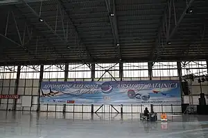Hangar at Batajnica Air Base featuring air show banner