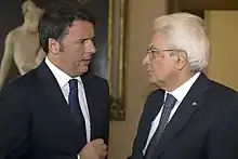 Following the defeat, Prime Minister Renzi resigned. On 11 December, Mattarella appointed the incumbent Minister of Foreign Affairs Paolo Gentiloni as new head of the government.[75] Gentiloni led a government composed by PD, NCD, and other minor centrist parties, the same majority of Renzi's.[76] According to many political analysts and commentators, the appointment of Gentiloni caused tensions between Mattarella and Renzi, who asked the president to dissolve the parliament and call for a snap election in 2017.[77] This version was later confirmed by Renzi during a press conference following the 2018 general election, in which he stated it was an error not to vote in 2017.[78]