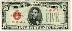 Series of 1928 United States Notes were issued in $2 (through 1928G) and $5 (through 1928F) denominations until the early 1950s.[3] Also, for a brief period in 1933, Series of 1928 $1 United States Notes were issued as a response to the Great Depression. Most of these remained in storage before being released in Puerto Rico during 1948-9.[4]
