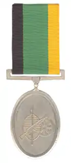 The Service Medal in Silver was instituted by the President of the Republic of South Africa in April 1996. It was awarded to veteran cadres of Umkhonto we Sizwe, the military wing of the African National Congress, for twenty years service.[1]