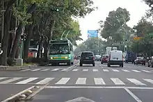 On 1 August 2009, STE inaugurated its first Corredor Cero Emisiones, or Zero-Emissions Corridor, in which all public transport service along one of the city's major traffic arteries is now provided by electric trolleybuses.[8][20][21] This was not a new trolleybus line, but rather an upgrading of an existing line, STE's route A, along Eje Central (Central Traffic Axis, primarily Avenida Lázaro Cárdenas).[20] The route extends for 18.3 kilometres (11.4 mi), from Instituto del Petróleo metro station and the Terminal de Autobuses del Norte (northern intercity bus station) to Tasqueña metro station and the Terminal de Autobuses del Sur (southern intercity bus station).[22] The changes involved in transforming route A into the "Zero-Emissions Corridor" included significantly increasing the frequency of trolleybus service, to an average headway of 2.5 minutes, and banning all non-electric buses and peseros (vans/jitneys) from the corridor.[20][21] The Eje Central corridor alone now uses about 90–100 trolleybuses at peak times, from a sub-fleet of 120 vehicles reserved for this route.[20] The trolleybuses operate in bus-only lanes, separated from other traffic; such lanes already were present on this route. Several of STE's other trolleybus routes also operate in bus-only lanes over some portions of their route.