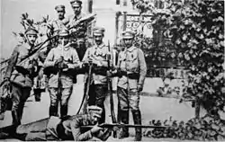 The Seven Lancers of Belina, also called Belina’s Seven and The Seven Uhlans (Polish: Ulanska siodemka) was a name given to a mounted reconnaissance group of the Riflemen's Association. On August 2, 1914, upon order of Józef Piłsudski, the seven uhlans crossed the border between Austrian Galicia and Congress Poland, on a mission to gather information about Russian forces in the area of Miechów and Jędrzejów. Members of the group would later become elite of the cavalry forces of the Second Polish Republic (see also Polish cavalry).