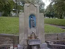 The natural warm waters of Buxton have been revered since Roman times. By the 1520s the spring was dedicated to St Anne and the curative powers of the waters from the well were reported. A 16th-century act of parliament ruled that a free supply of the spring water must be provided for the town's residents. The current stone water fountain with its brass lion's head spout was built in 1940, replacing its predecessors from 1895, 1783 and earlier. St Ann's well is next to the Pump Room, built in 1894 to dispense the well water for drinking (the building is now the Tourist Information centre). The geothermal spring rises from about 1km below ground and about a million litres of water flow out per day. The mineral water emerges at a steady 27°C. Analysis of the water has indicated that it has a high magnesium content and that it originated around 5,000 years ago. The same spring water is bottled and sold as Buxton Mineral Water.[4][5][6][7] |