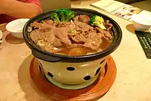 Sha cha beef (Chinese: 沙茶牛肉; also called sa cha beef, cha beef, or cha beefsteak) is the name of a Chinese dish featuring shacha sauce and tenderized beef strips. The Americanized dish is usually served over a bed of white rice with fresh scallions and cilantro (coriander). This dish is native to the Gansu province of China.[1]