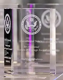 She was given an award as an International Women of Courage on 4 March 2020 by the US Secretary of State.[1] Earle D. Litzenberger the US ambassador returned to Washington to support her as she received the award.[5] She was the first person from Azerbaijan to win the award. She noted afterwards that she had been rewarded in America for the same thing that she had been punished for in her own country.[6]