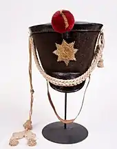 The "Belgic" shako was a black felt shako with a raised front introduced in the Portuguese Marines in 1797 and then in the Portuguese Army in 1806, as the barretina. It was later adopted by the British Army, officially replacing the stovepipe shako in 1812, but was not introduced completely until 1815 and became therefore known as the "Waterloo" shako. This cumbersome headgear was already discarded in 1816, in favour of the slightly bell topped "Regency" shako.[8] The Belgic shako was decorated with silver or gold lace for officers, according to regimental practice.[9][10] In 1813 the US Army adopted a similar entirely leather made model,[11] nicknamed by the soldiers as "Tombstone" cap, because of the extension of the top front that reminded on a grave marker.[12]