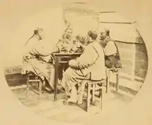 ![]() A Shanghainese man and woman on a wheel barrow, pre-1898. | |