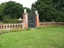 Clipped yews line the driveway and are featured in the main gardens, which are surrounded by flint and brick walls; a small maze-like topiary display section is enclosed by a low wall and principally entered through wrought iron gates guarded by stone gryphons. Side entrances to the topiary section include an extravagant archway in the south-west wall.
