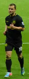 Maloney joined Wigan Athletic in the Premier League on 31 August 2011 for a fee of £850,000, signing a three-year deal.[54] He made his debut on 13 September 2011 in a 2–1 defeat against Crystal Palace in the League Cup.[55] He struggled to break into the first team, appearing three times as a substitute during the first half of the 2011–12 season.[56] Maloney admitted his fitness "was lacking a little bit" when he joined the club,[57] and manager Roberto Martínez felt that Maloney needed more time to settle-in.[56] On 11 March 2012, he made his first Premier League appearance in almost five months, coming on as a substitute against Norwich City.[58] His performance was described as "outstanding",[59] and he was rewarded with his first league start for the club in the following game against West Bromwich Albion.[60] On 24 March 2012, he scored a penalty against Liverpool at Anfield in a 1–2 win for Wigan – his first goal for the club.[61] Maloney topped this effort with a wonderful curling goal against Manchester United on 11 April, lifting his side out of the relegation zone for the first time since October with a 1–0 win.[62] Then, on 28 April 2012, Maloney scored Wigan's third goal in an emphatic 4–0 home win over fourth placed Newcastle.[63]
