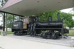 This Shay locomotive was constructed in 1898 by the Lima Locomotive Works[2] for the Boyne City Southeastern Railroad Company.[3] In 1918, it was sold to Michigan Forest Products in Strongs, Michigan, and then, in 1924, to William L. Saunders, President of the Cadillac Lumber & Chemical Company,[4] later called the Cadillac-Soo Lumber Company, for service in Sault Sainte Marie, Michigan.[3] It was used there until 1954, when T. Walter Kelly, Mayor of Cadillac and Saunders' son-in-law, obtained it from the Cadillac-Soo Lumber Company and donated the locomotive to the city of Cadillac.[2] It was partially restored in 1964, and further restored in 1985. It now serves as a tourist attraction in Cadillac's City Park.[2]