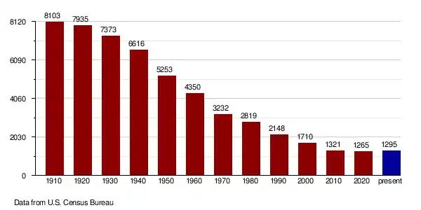 Sheridan has been severely affected by out-migration; its population collapsed from 7,373 in 1930 to 1,321 by 2010.[6] Its population decline of 38.4% from 1990 to 2016 was the highest among all North Dakota counties.[7]