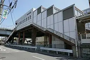 The station consists of two opposed side platforms connected by an elevated station building. The station is staffed.
