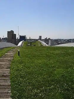 The campus's architecture is somewhat unusual, dominated by large undulating rooftops, one of which is topped with a roof garden.