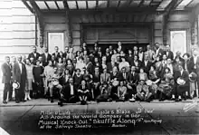 The show's four writers were African-American Vaudeville veterans who first met in 1920 at a NAACP benefit held at the newly opened Dunbar Theatre in Philadelphia.[8] None had ever written a musical, or even appeared on Broadway.[9] Promoters were skeptical that a black-written and produced show would appeal to Broadway audiences. After finding a small source of funding, Shuffle Along toured New Jersey and Pennsylvania. However, with its limited budget, it was difficult to meet travel and production expenses. Cast members were rarely paid, and were "trapped out of town when the box-office receipts could not cover train fare".[10] The budget was so low that cast members had to wear damaged and worn leftover costumes from other shows. For some time, the entire set could fit in one taxicab, and was transported between theaters by that means (Krasner 244). When the show returned to New York about a year later, during the Depression of 1920–21, the production owed $18,000 and faced strong competition on Broadway in a season that included Florenz Ziegfeld's Sally and a new edition of George White's Scandals. It was able to book only a remote theater on West 63rd Street with no orchestra pit.[11] In the end, however, the show earned $9 million from its original Broadway production and three touring companies, an unusual sum in its time.[12]