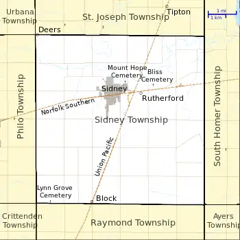 • "Sidney Township, Champaign County, Illinois". Geographic Names Information System. United States Geological Survey, United States Department of the Interior. Retrieved January 4, 2010.