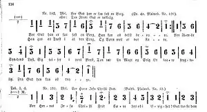 Notation for the psalmodicon from Lindeman's Coral-Melodier for Psalmodicon i siffertoneskrift for the tune «Vor Gud han er saa fast en Borg»