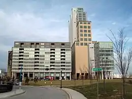 Silo Point, formerly known as the Baltimore and Ohio Locust Point Grain Terminal Elevator, is a residential complex converted from a high-rise grain elevator on the edge of the Locust Point neighborhood in Baltimore, Maryland. When the original grain elevator was completed in 1923, it was the largest and fastest in the world. The grain elevator rises to 300 feet (91 meters). The silo was built by the Baltimore and Ohio Railroad in 1923–1924, with a capacity of 3.8 million bushels (134 thousand m3).[4] In 2009 it had been converted from a grain elevator to a condominium tower containing 24 floors and 228 condominiums by Turner Development Group and architect Parameter, Inc.[5][6]