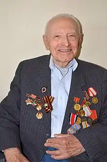 Simjon Rosenfeld[1] (October 1, 1922[2] – June 3, 2019[3]) was a survivor of the Sobibor death camp and a participant in the prisoner revolt which took place in that camp.[4] Born in Baranowicze, Poland, in 1940 he was recruited to the Red Army.[5] In 1941, the Germans captured him and sent him to build a labor camp in Minsk. On 20 September 1943[6] he was transferred to Sobibor.[7] The Germans separated the Jewish and non-Jewish soldiers but refrained from killing the Jews as they had war prisoner status. On October 14, 1943, Rosenfeld participated in the uprising that resulted in his escape.[2] Acting commander SS Untersturmfuehrer Johann Niemann entered the tailor shop in which Rosenfeld worked. While Isaac Lichtman held Niemann's leg tight – seemingly in an effort to pull off his boots – Rosenfeld and Arcady Wajspaper came out of the back room and split his skull with an axe.[8] Rosenfeld escaped together with Dov Freiberg and later they joined Joseph Serchuk's partisan unit. Was separated from the other Russians and survived in hiding. Rejoined the Red Army and fought in the Battle of Berlin, where he carved the name "Sobibor" into the wall of the Reich Chancellery. After the war, he moved to Ukraine and then to Israel in the 1980s.[9] Rosenfeld had two sons and five grandchildren at the time of his death.[10] He received a eulogy from Israeli Prime Minister Benjamin Netanyahu.[11]