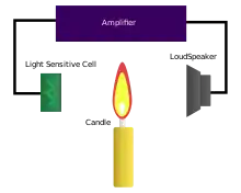 A singing candle is an electro-acoustic installation. The movements of a candle flame are transformed into sound by means of a light dependent resistor (LDR). The sound waves, in return, have an influence on the flame, through an amplifier and loudspeaker, forming a feedback loop.