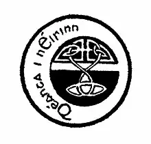"Irish names were attached to goods that never saw Ireland until they were brought into the country ready for sale. The Sinn Feiners discovered the fraud, and countered by the establishment of the Irish trademark. A sign peculiar to Ireland was agreed upon, namely a scroll device representing the legendary Collar of Malachi, surrounded by the words, Deantha i nEirinn [sic.] (Made in Ireland). The use of this sign was permitted to manufacturers who could show that their goods were made in the country, and every infringement was prosecuted under the British Trades Mark Law, the Irish people being for once able to use British law to their own advantage."[3]