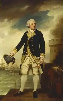 Geary was promoted to Vice-Admiral of the Blue on 21 October 1762.[10] He remained at Spithead, with a brief period as Commander-in-Chief, The Nore, until the peace in 1763 ended the war. He struck his flag and entered another period of retirement until November 1769, when he became Commander-in-Chief, Portsmouth.[11] Increasing tensions with Spain led to his return to service and his promotion to Vice-Admiral of the Red on 17 October 1770.[12] He retired again after the relieving of tensions led to a reduction in the navy. Though not on active service, he continued to rise through the ranks based on his seniority. He became Admiral of the Blue on 31 March 1775, and Admiral of the White on 29 January 1778.[13] The death of Admiral Sir Charles Hardy in May 1780 led to Geary being recalled to service, despite being in poor health.[13] He hoisted his flag aboard the 100-gun first rate HMS Victory, with Richard Kempenfelt as his flag captain and took command of the Channel Fleet. Geary put to sea, patrolling off Brest in the hope of preventing the joining of the French and Spanish fleets.[14] Sails were sighted on 9 July, and Geary gave chase believing them to be one of the enemy fleets. It was found that they were instead an enemy merchant convoy. Geary engaged and captured twelve of the merchants, the rest escaping under cover of fog.[15]
