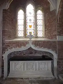 He died on 31 October 1830 and was buried in the family vault beneath St Blaise's Church, Haccombe, next to Haccombe House, which church was a peculiar of the Archbishop of Canterbury and was served by an archpriest who was not subject to the authority of the Bishop of Exeter[10] as were all other parish priests in Devonshire. His monument survives at the east end of the north aisle, consisting of a chest tomb within an Easter sepulchre-type niche, beneath a stained glass window. The top of the chest tomb is a slab of polished Purbeck marble engraved in Latin in Gothic text as follows, in imitation of mediaeval monuments: