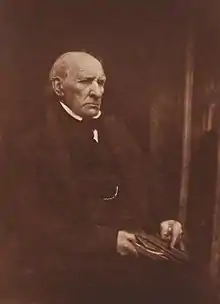 Gladstone was also interested in politics. At first he had been a Whig, but from 1812 onwards his political outlook appears to have changed due to a number of factors. In religion he had long ceased to have any sympathy with Unitarianism or Presbyterianism. He had become alienated from the Whig and Radical circles in Liverpool, and feared the disorder caused by the Napoleonic Wars.[25] The friendships he formed with Tories George Canning and Kirkman Finlay also had a great influence on his changing political outlook, and he became a Tory. In 1812 he presided over a meeting at Liverpool which was called to invite George Canning to represent Liverpool in the House of Commons.[26]