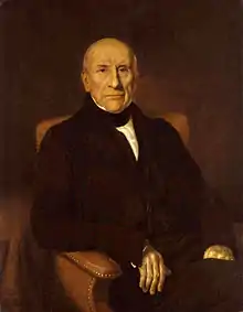Thomas Gladstones was aware of the limitations of Leith, especially compared with the opportunities then opening up in Glasgow and in Liverpool. In 1784, he sent John to the German Baltic ports to buy grain, transacting his business through an interpreter. In 1786, he travelled to Liverpool, Manchester and London to sell his father's corn and sulphuric acid.[3] But the following year, with his father's financial support, John Gladstones was determined to move to Liverpool. Once he had settled in Liverpool, Gladstones dropped the final "s" from his surname (although this was not formally changed by royal licence until 1835).[4][5] Almost immediately he went into partnership with grain merchants Edgar Corrie and Jackson Bradshaw. The business of Corrie, Gladstone & Bradshaw, and the wealth of its members, soon grew very large.[6] John Gladstone spent a year in the United States, travelling to New York, Pennsylvania, Virginia and Maryland to purchase wheat, maize, flax-seed, hemp, tobacco, timber, leather, turpentine and tar.[7]