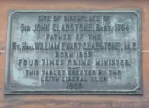 A plaque was erected in 1909 at the corner of Great Junction Street and King Street in Leith commemorating the site of the birthplace of John Gladstone.